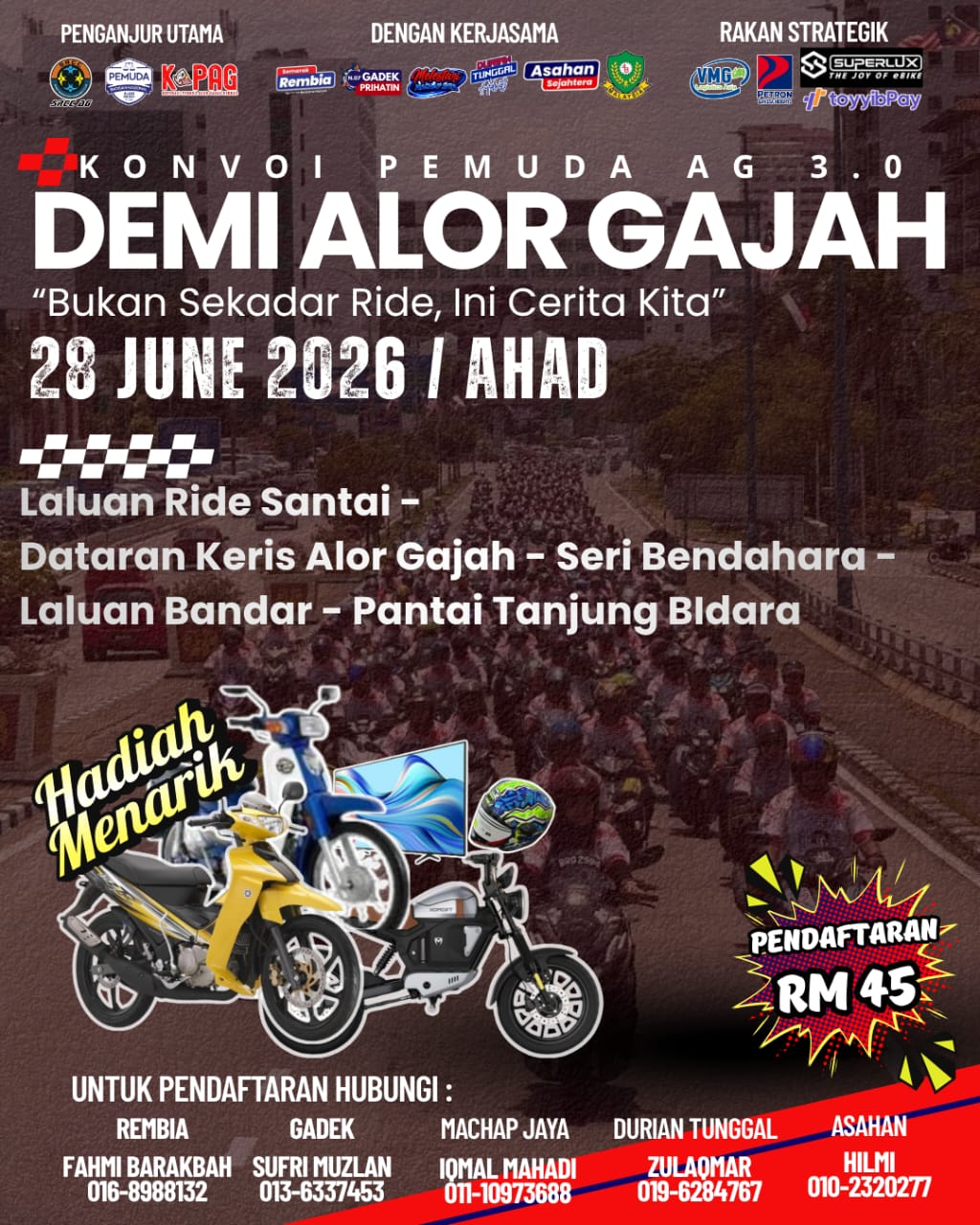 Alhamdulillah, selepas kejayaan luar biasa Konvoi Pemuda AG 2.0 pada 21 September 2025, Pemuda UMNO Alor Gajah kini kembali mengorak langkah dengan penganjuran Konvoi Pemuda AG 3.0 – sebuah program khas yang bakal menghimpunkan ratusan penunggang motosikal dan anak muda dari seluruh pelusuk negeri, dengan semangat satu hati dan satu matlamat!